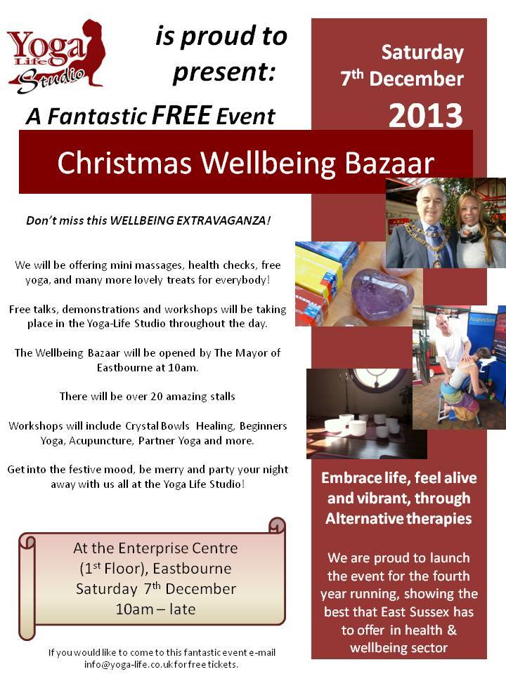 Don’t miss this Christmas Wellbeing Extravaganza on Saturday, 7th December from 10am to 8pm ! We shall be offering Seated Acupressure massages and officially opening the Yasuragi Shiatsu Studio with no hands massage tasters. There will be over 20 amazing stalls offering mini massages, a variety of other treatments,health checks, free yoga and many more lovely treats for everybody! Free talks, demonstrations and workshops will be taking place in the Yoga-Life Studio throughout the day.Workshops will include Crystal Bowls Healing, Beginners Yoga and many more. FREE ENTRY.